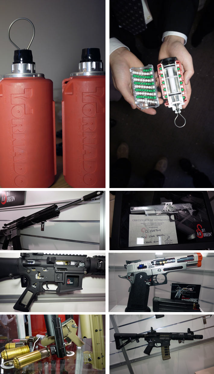 A big LCD screen was showing videos the whole time about the motion tracker. Once you were done watching the motion tracker video they had one new presentation waiting for you. Airsoft Innovations were right there and explaining their new Impact grenade. The walls and displays were stuffed with high end custom guns from Airsoft Surgeon and parts from Deepfire and Hurricane. All of these presented by true airsoft celebs.