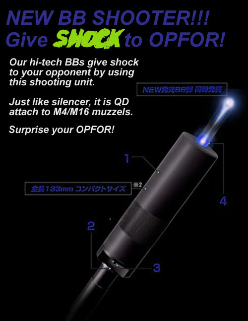 Another requirement before using the BBs in a skirmish is the Activation Unit. Similar to the Tokyo Marui Tracer Unit, this activation unit is a QD silencer-type attachment that is powered by 2 CR123a Lithium Batteries. Once the BBs are fired, the Activation Unit gives another small quick electrical charge to the passing BBs to make the BBs come "alive", that is, they are now ready to release their charge to anything they hit. The Activation Unit requires at least .8 joule of energy in the passing BB in order to make it "alive". Below .8Joule, then BBs will just be like Tracer BBs, the charge won't be released though, only a light show.