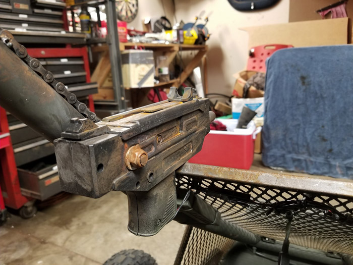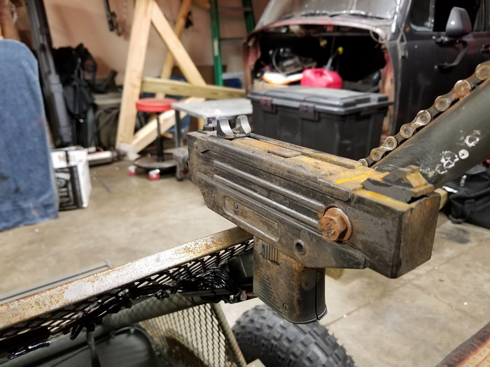 The airsoft components are two cheap UZI AEGs that were bought for US$20 each and given the rust treatment. Both are fired simultaneously with a switch that is mounted on the steering wheel and they work. So far most of the testing are inside his garage, we hopefully we get to see this in action next time.