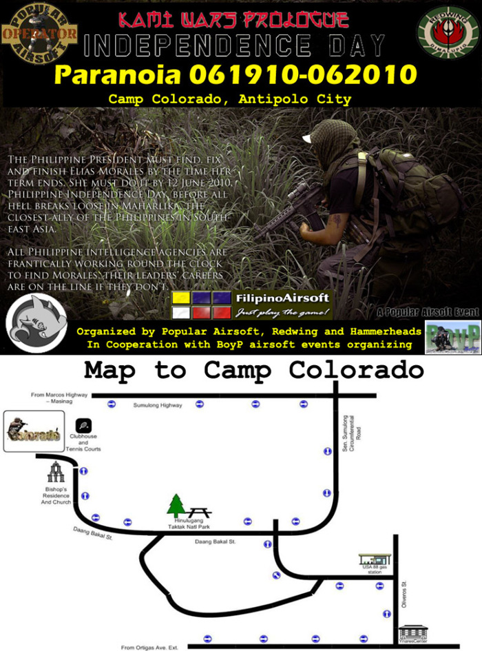 It's finally on! The preparations for the Kami Wars Prologue: Independence Day is now at full swing! Originally set for the Philippine Independence Day, 12 June 2010, it has now been moved to the 19-20 June 2010 as the venue to accommodate a larger number of players has finally been found. This will be an overnight gruelling milsim event. RedWing and Hammerheads are leading preparations with the assistance of the airsoft skirmish site maintainer, Boyp Airsoft Airsoft Events: