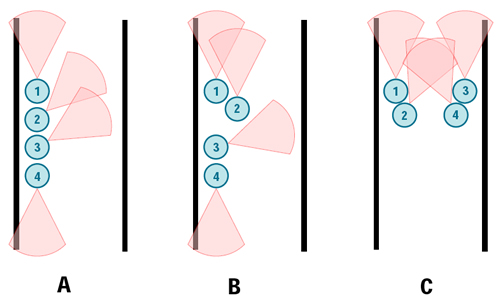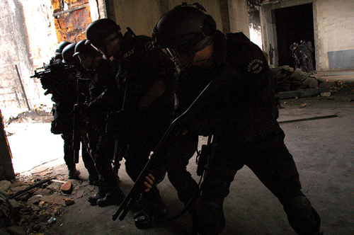 Moving through long corridors is always dangerous as tangos can pop out of any number of doors and corners while you don't have cover available. You just have to move quickly and quietly, and shoot them first. The team can adopt a variety of formations depending on the floor plan and situation. In Formation A the team moves in a single column close to a wall with their fire sectors covering a 180-degree angle. Formation B, where the first and second man does a high/low to maximize forward fire, is automatically deployed whenever the team stops moving. Formation C is used when moving up to clear a T-intersection.