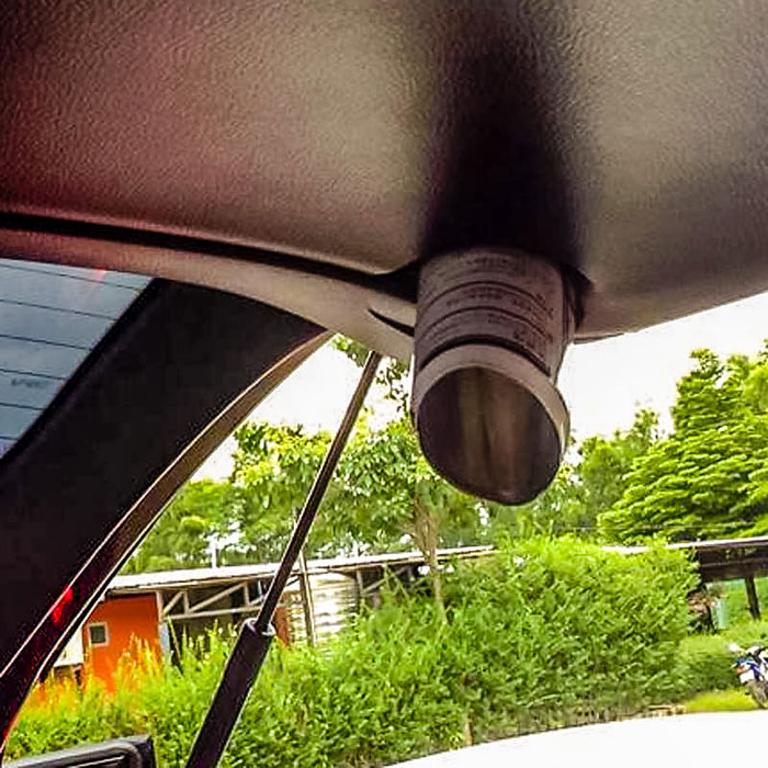 As you can see in the photos, a gas canister got lodged to the car's ceiling in the upper door lining of the backdoor of the car, a result of it being propelled upward as the gas inside expanded due to hot weather, causing it to explode.