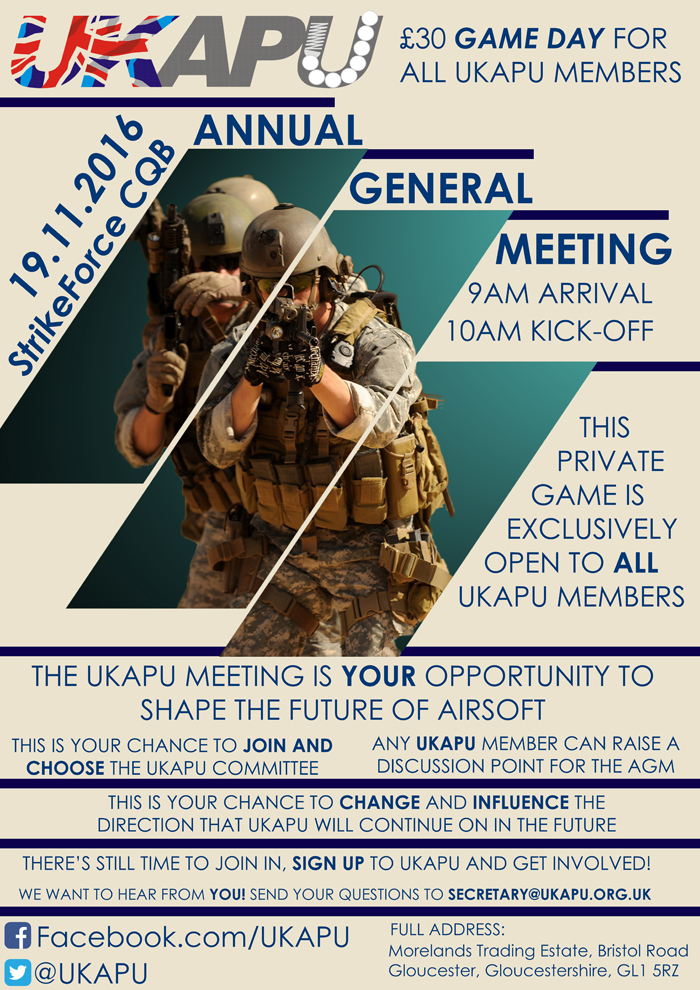 The AGM will be an opportunity for all UKAPU members to raise subjects for the agenda, elect committee members, and shape the future of UKAPU for airsoft in the UK.