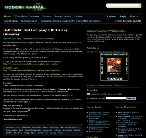 Modern Warfail2 calls COD MW2 "the biggest FAIL in PC FPS gaming history" documents cases from all over the world the experience of players using the PC version. It also dispels what Infinity Ward has been touting as a better experience for gamers, that a peer to peer (P2P) service is much better than the dedicated servers that PC gamers have been so used before.