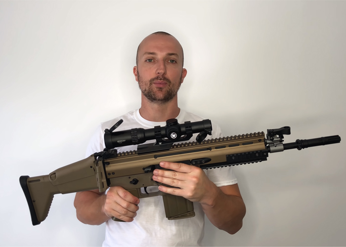Mounted on the Tokyo Marui SCAR-H NEG is the Vortex Optics Strike Eagle 1-6X24 Shortdot Riflescope that is featured by The Heresy Group. It is dual use, meaning it can be used for both hunting and tactical purposes.