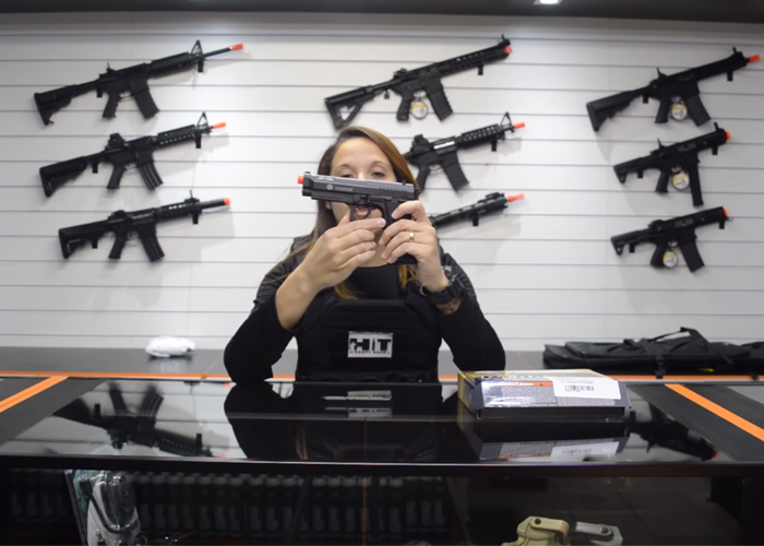 Carol Grillo features the Taurus PT82 CO2 Blowback Pistol. Based on the Beretta 92 pistol that is manufactured by the Brazilian weapons manufacturer, Taurus, this is full licensed by Cybergun.