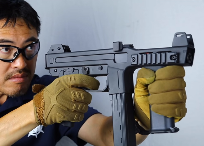 The AEG based on the Italian Spectre SMG gets checked by Mach Sakai. The S&T M4 Spectre SMG is mainly made of Polymer with a built-in foregrip that has a battery compartment. This can be powered by an 8.4v Mini Battery and comes with 48-round BB magazine.