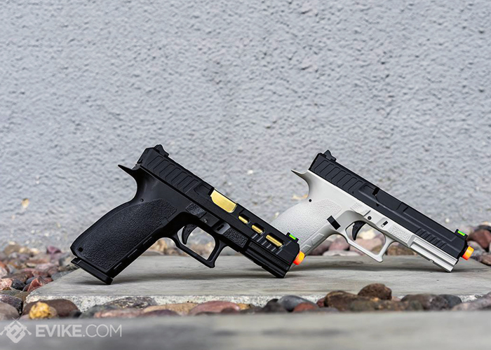 Evike.com received a delivery of the KJ Works KP-13 GBB Pistol which is available in three colours and come with fibre optic sights... "Lightweight slide cuts? Check! Special frame color? Check! Feast your eyes on the KJW KP-13.