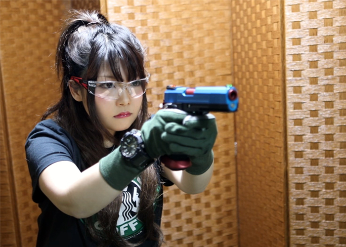 Vera Rockrose tries shooting a Hi-Capa GBB Pistol from AW Custom. As they have several Hi-Capa models, the version she uses is the AW HX1005 with its red, black and blue colours.