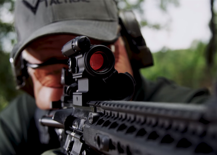 Larry gives a rundown on the Aimpoint CompM5 red dot sight for this Vickers Tactical video. This has a battery life of 5 years of continuous use and allows for unlimited eye relief.