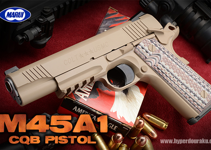 Hyperdouraku reviews the latest gas blowback pistol from Tokyo Marui that would make .45 handgun fans happy. The Tokyo Marui M45A1 CQB GBB Pistol is based on the MEU replacement. This has an integrated rail and desert tan colour.