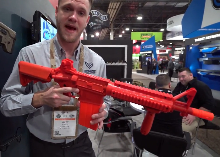 Umarex got a brightly coloured rifle on display at the SHOT Show 2018. Matt got his hands ont he Umarex Foam Dart which he says can fire NERF Darts as well their own Foam Darts. Designed like an AR it can take in a NERF magazine too. It is powered by two CO2 shells installed in the stock.