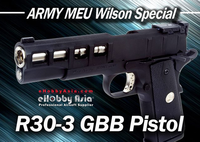The ARMY MEU Wilson Special Full METAL GBB Pistol (R30-3) is now available at eHobbu Asia. This based on the Caliber .45 MEU (SOC) used by the USMC Expeditionary Unit.