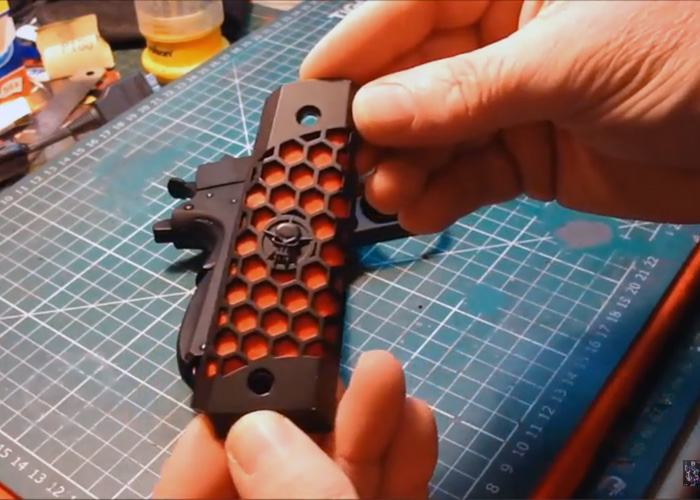 Flanker Tanker shows the mod he did on the Hex Grip panels for the WE Airsoft 1911 GBB Pistol...