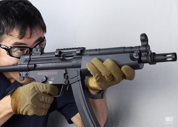 Mach Sakai takes another MP5-J AEG and it's the CYMA CM049J. This has an electric blowback feature. The standard CM049J has an initial muzzle velocity of 440fps but this version has been downgraded to meet Japanese limits.
