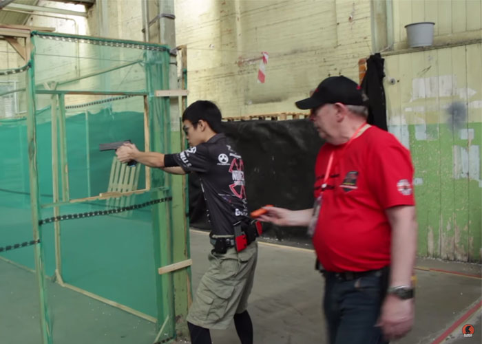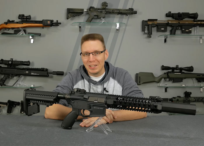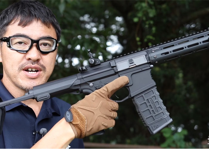 Mach Sakai inspects the airsoft version of the Honey Badger from G&G Armament. The G&G PDW15 has fully ambidextrous controls, M-Lok Handguard, and an integrated mock suppressor.