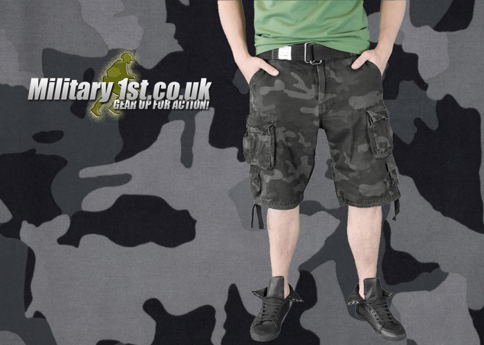 Surplus Division shorts in different colours and camo patterns, such as the black camo shown here, are in stock at Military1st.co.uk...