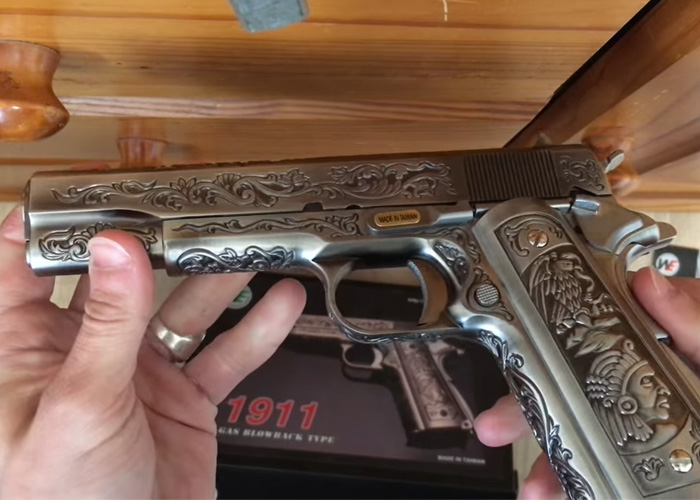 AirsoftNLD reviews the WE Airsoft 1911 "Mehico Druglord" Gas Blowback Pistol. Others call it the "Floral Engraved" 1911 GBB Pistol so as not to make it sound lawless.