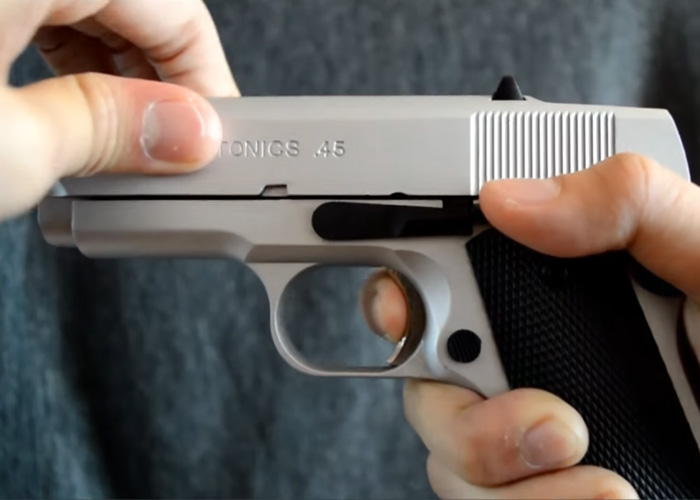 Tkn27 shows his Army Armament R45 Detonics Silver GBB Pistol for this video. This is a clone of the Marui Detonics .45 Combat Master GBB in Enviro Hard Chrome... "This is my ARMY R45, or the Detonics Combat Master, in Silver.