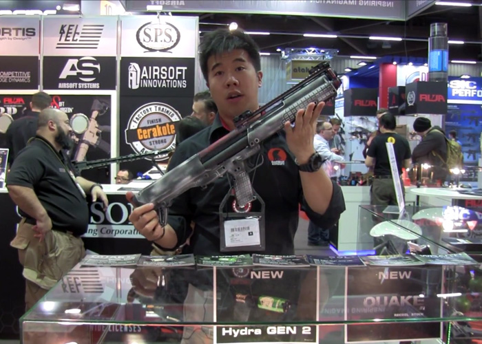 Max Lai of RedWolf Airsoft shows a Marui KSG Gas Shotgun given the custom Cerakote treatment done by a new company in Hong Kong called Kyo Cerakote during the IWA Outdoor Classics 2017.