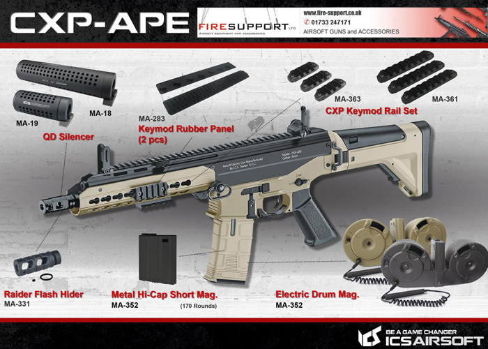 Another AEG in the ICS CXP-Series is available right now at Firesupport. The ICS CXP-APE AEG... "The CXP-APE AEG features a full metal monolithic upper rail and upper receiver.