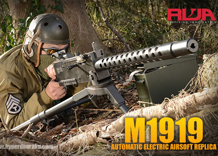 Hyperdouraku got a biggie to review this time, the RWA M1919 airsoft machine gun. RWA partnered with Viva Arms to bring this tripod mounted monstrosity that includes a 5,000-round BB box magazine that comes with simulated bullet belt feed and rattling system.