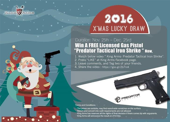 A chance to win a Predator Tactical Iron Shrike GBB Pistol from King Arms by participating in their Facebook Christmas Event.... "The Predator Tactical Iron Shrike by King Arms. Metal slide and frame with CNC engraved lettering and logos.