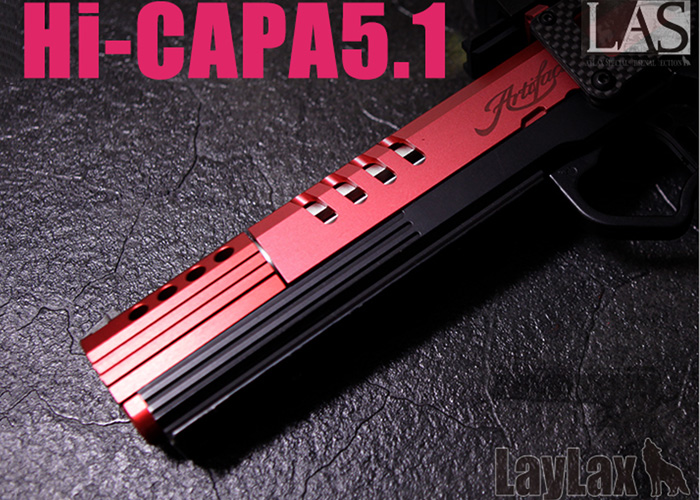 Now available at Laylax is a Crimson-coloured Lower Frame and Compensator for the Tokyo Marui Hi-Capa 5.1 Gas Blowback Pistol, the most customised airsoft pistol of all time.