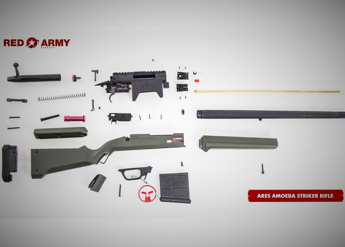Want to learn more about the bits and pieces of the new Ares Airsoft Amoeba Striker S1 Sniper Rifle? The Red Army Airsoft Club have already done the job for you and they posted photos of the fully disassembled Strike S1 on Facebook.