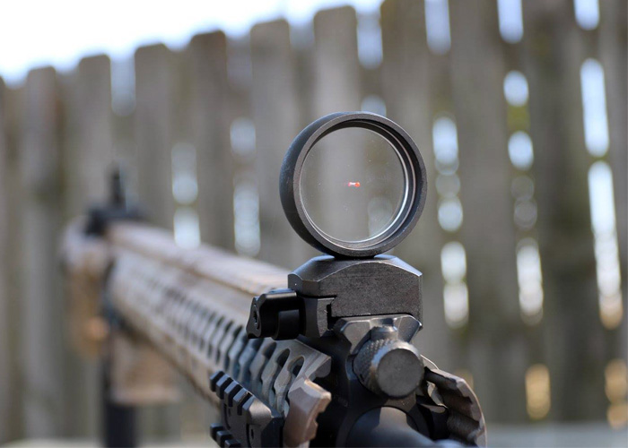 Check out this iron sight from Clear Image Solutions thta cna be used with the reflex sight or your rear iron sight and does not require batteries and you can swap the lenses from Red Dot to Green Dot..