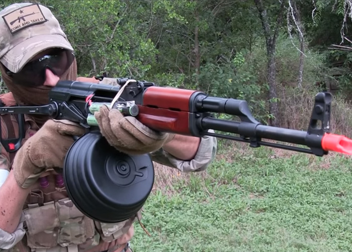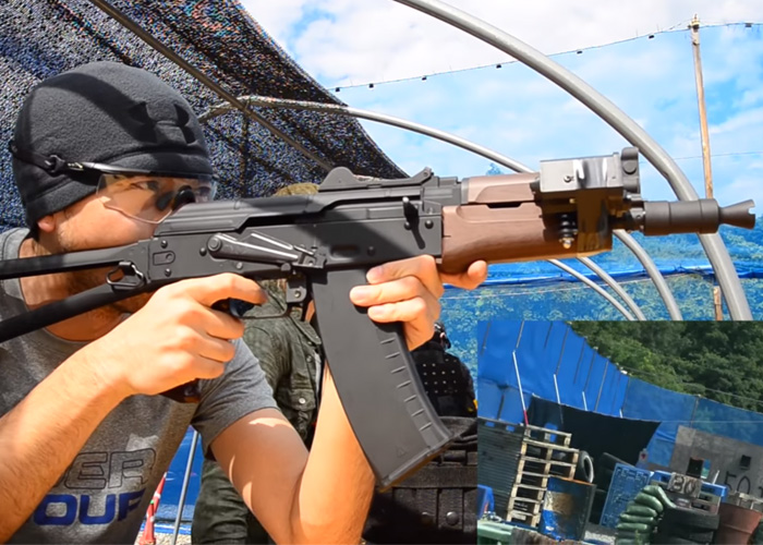 Takuya Sakamoto of Sakataku TV brings the KSC AKS74U Gas Blowback Rifle to the rannge. Using G&G 0.25g BioBBs he fires the gas blowack at 30 metres and 40 metres.