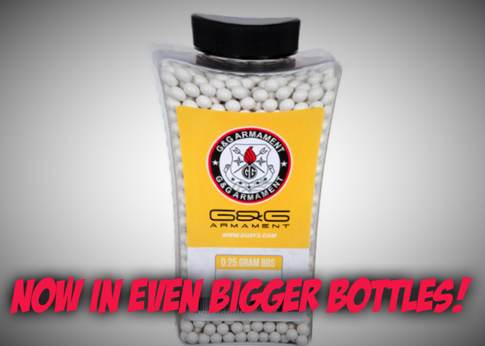 G&G Armament's Perfect BBs that are sold in bottles will be available in more quantities as they have made the bottles bigger... "G&G Armament's Bottled BBs are back in higher quantities and biodegradable material!