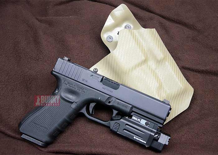 Latest custom work by Bunny Workshop is not about a gas blowback rifle but a Kydex Holster this time and is made to fit Glock 17 Gen 4 GBB Pistols that are kitted with a weaponlight or a laser at the under rail...