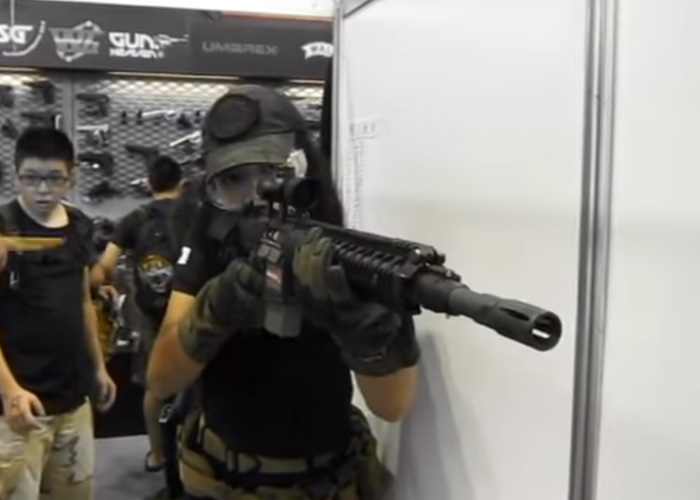 Annie Wu, aka Angel Anny, who is the most familiar female face in the Taiwan airsoft scene, tests the Rare Arms XR-25 Gas Blowback Rifle during the 18th Hooha Show in Taipei last year.