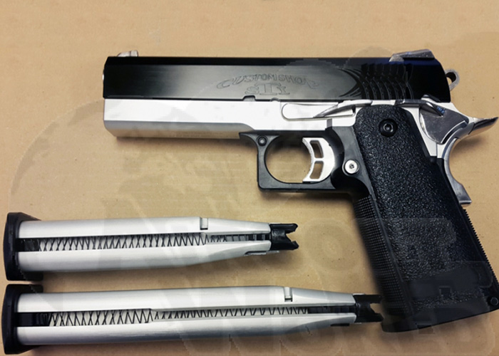 The A.W.E. 4.3 Hi Capa STI Custom with Silver Frame, Black Slide, and Silver Sights at Airsoft World is all yours to take as long as you've got £349.95...