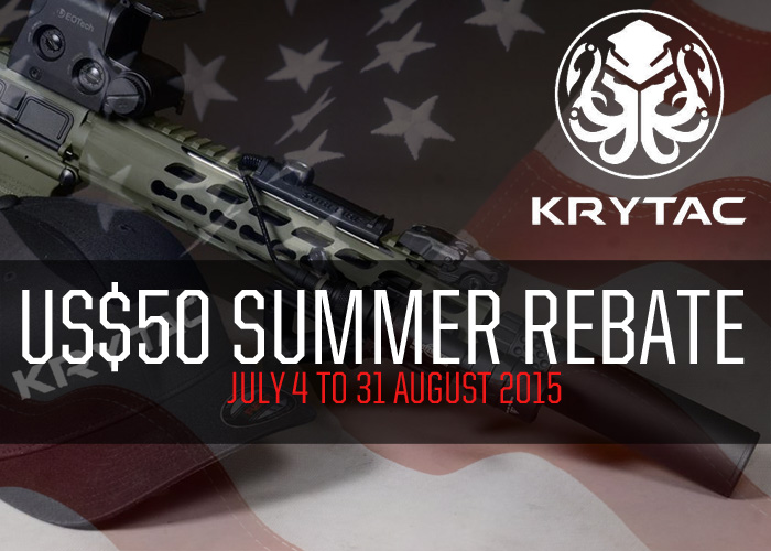 Get something back for your Krytac AEG purchase as long as you register your AEG online. It's US$50 rebate for their Summer Rebate starting today... "Purchase a Trident PDW, CRB, or SPR at an authorized KRYTAC Retailer to receive $50 towards the KRYTAC ProShop.