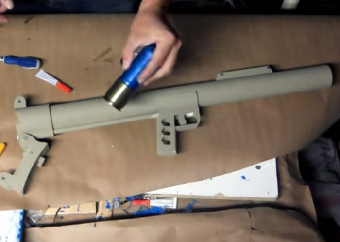 A video from Milsim Labs shows their new 40mm Bullpup Launcher. This launches a foam projectile that is powered by the 40mm gas shell.