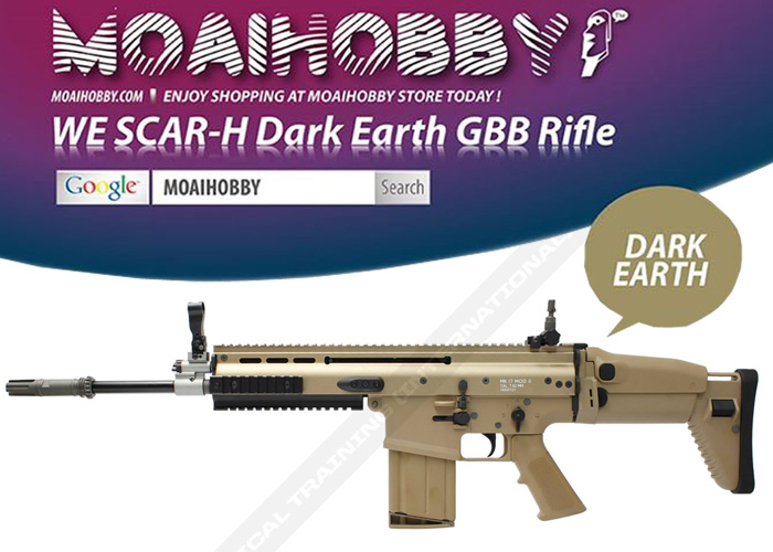 MoaiHobby sent in news that they now have in stock the new WE Airsoft SCAR-H Open Bolt Gas Blowback Rifle in Dark Earth Colour..."The WE SCAR-H GBB Open Chamber Gas Blow Back Rifle fires in Fully & Semi Au