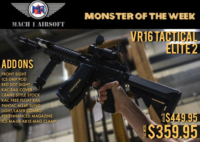 Here's the Monster of the Week offer from Mach 1 Airsoft --- a VFC VR16 Tactical Elite II Carbine loaded with the accessories that you can get in one good package at a reduced price...