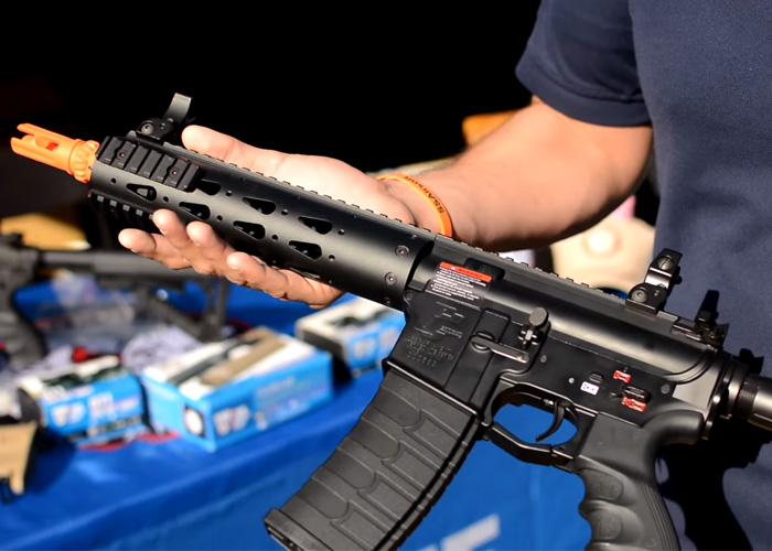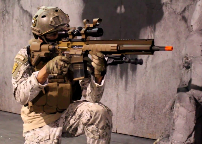 The Elite Force/Umarex Heckler & Koch G28 DMR AEG is on display in the USA as it goes around getting feedback from various players. First seen and announced at the IWA Outdoor Classics 2015 in Germany, the G28 OEM is Vega Force Company (VFC), and comes in the RAL8000 colour scheme.