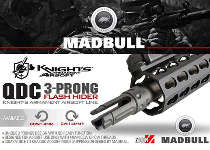 Jag Precision announce that the MadBulll KAA QDC 3-Prong Flash Hider will be arriving soon... "The QDC Airsoft Dummy suppressor is unique because of its quick detach mechanism. The thread of the flash hider has been modified to ONLY fit the airsoft version.