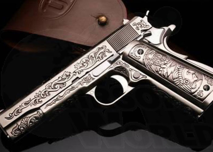Got a need for a blinged up airsoft pistol? The Airsoft World just might have what you need... "The Classic 1911A1 Colt. Devoid of markings? Not a chance!