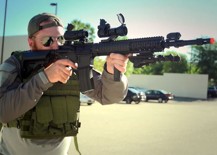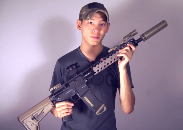 What Spartan117gw is holding in his "The Armory" episode is a nice looking piece of kit from PTS Syndicate. The airsoft rifle he has on his hands is the PTS RM4 ERG Scout which is the AEG with blowback and recoil system.