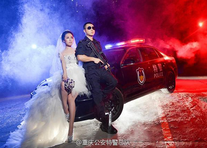 So what does a Chongqing SWAT Team member need to do when he is not allowed to take leave to get some proper pre-wedding photos with his wife-to-be? Bring the bride and the photographer to his work place to do the photos there instead.
