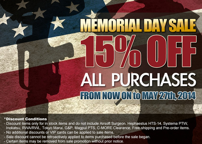 It's Memorial Day Weekend and Tim, now as a Drill Sargeant from RedWolf Airsoft tells about their sale in observance of this event... "We were here to remember the ones fallen during the wars!