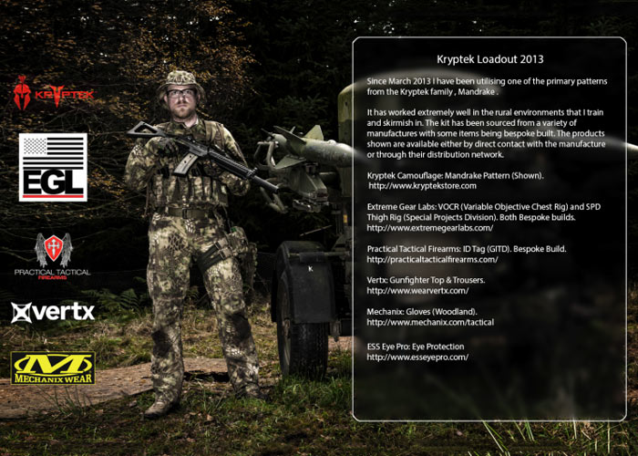 A good list of Kryptek Mandrake items which should be a good guide for those putting a similar loadout... "A long time has passed since we posted a new load out to our Gear Gallery. But now we´re back with a new one. This time we invited our reviewer Richard aka FireBase Aplpha to present his Kryptek loadout.