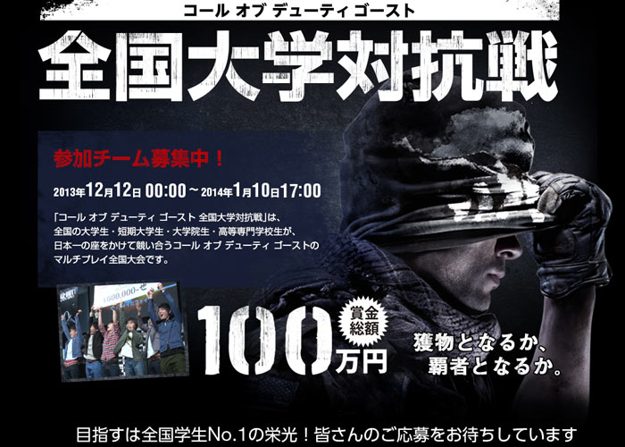 Gaming teams from the different colleges and universities in Japan are now being called on to take on the challenge of Call of Duty: Ghosts with Square Eanix of Japan calling for a National Intercollegiate Game.