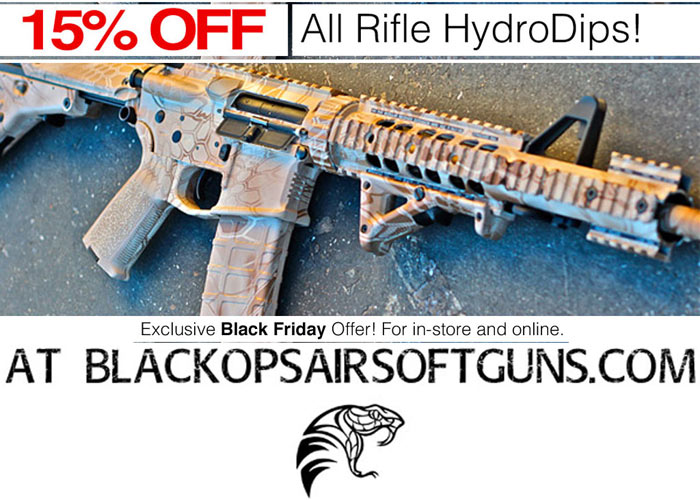 Take advantage of this offer from Black Ops Airsoft as they are having their Black Friday Sale as they will have major MAP price drops and for those who want their very popular Hydrodip custom service, they will be on sale too tomorrow and it will be just on Black Friday so watch their website when it updates for tomorr