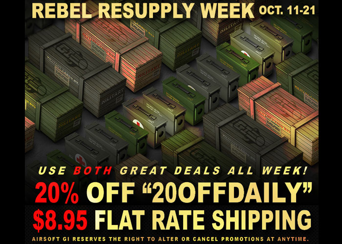 Better hurry up on getting a 20% discount from Airsoft GI during their Rebel Resupply Week which is conjunction with Bob's Rebel Training Camp which will be happening this weekend.