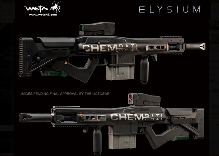 Here's your chance to own one of the Elysium: TST Chem Rail - Dual Stage Linear Motor Rifle which is a replica of the prop used in the movie "Elysium" starring Matt Damon.